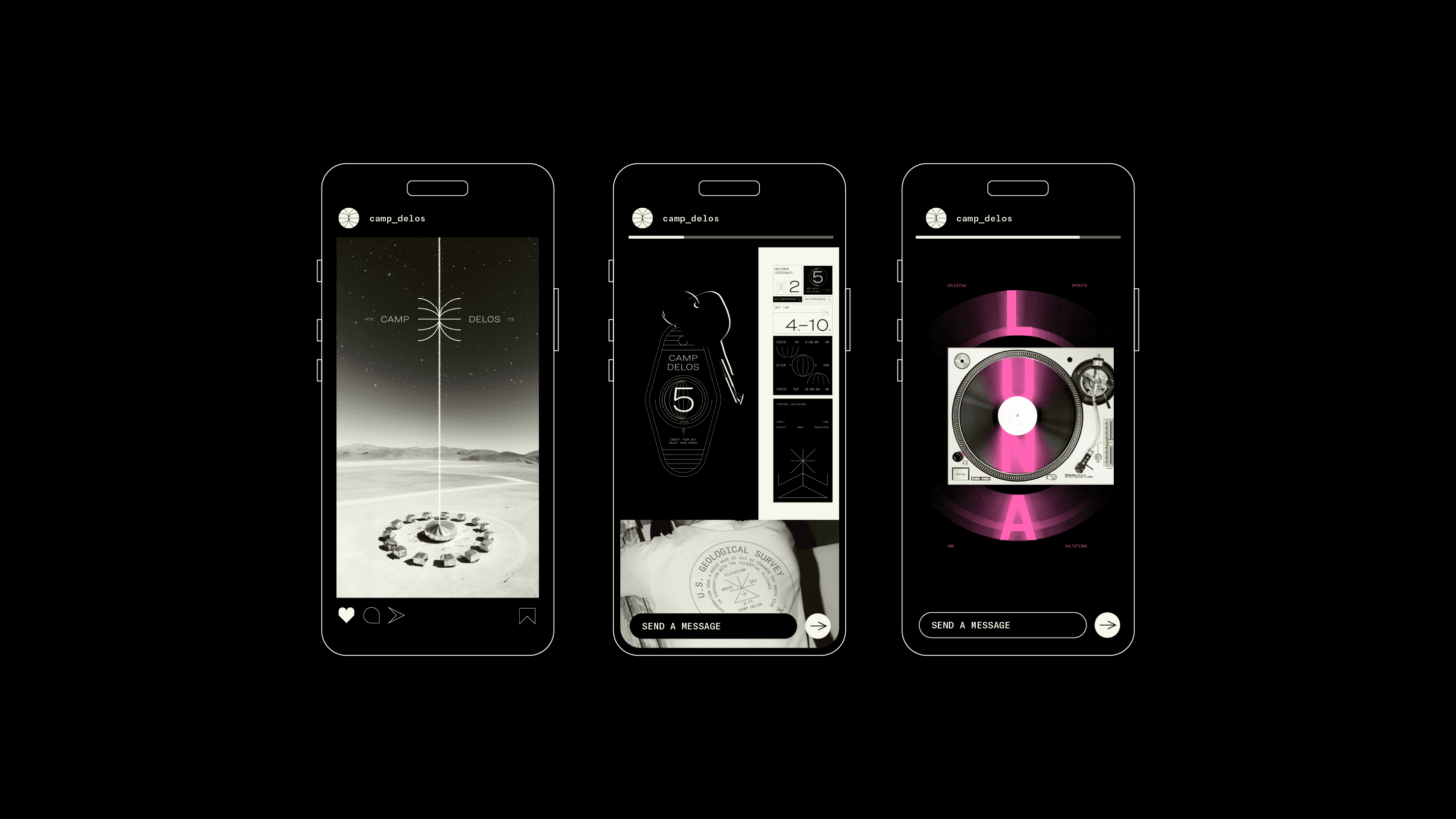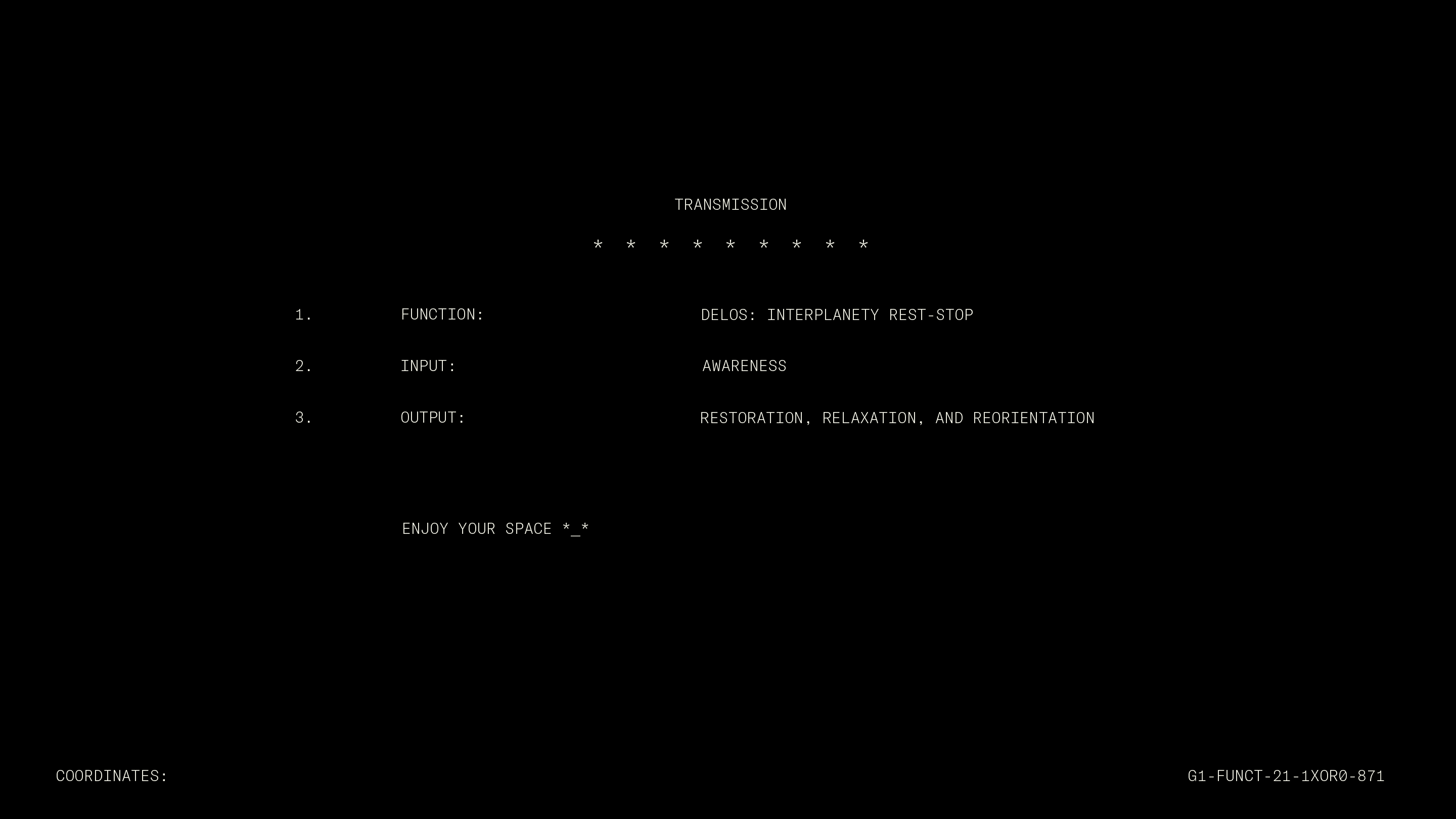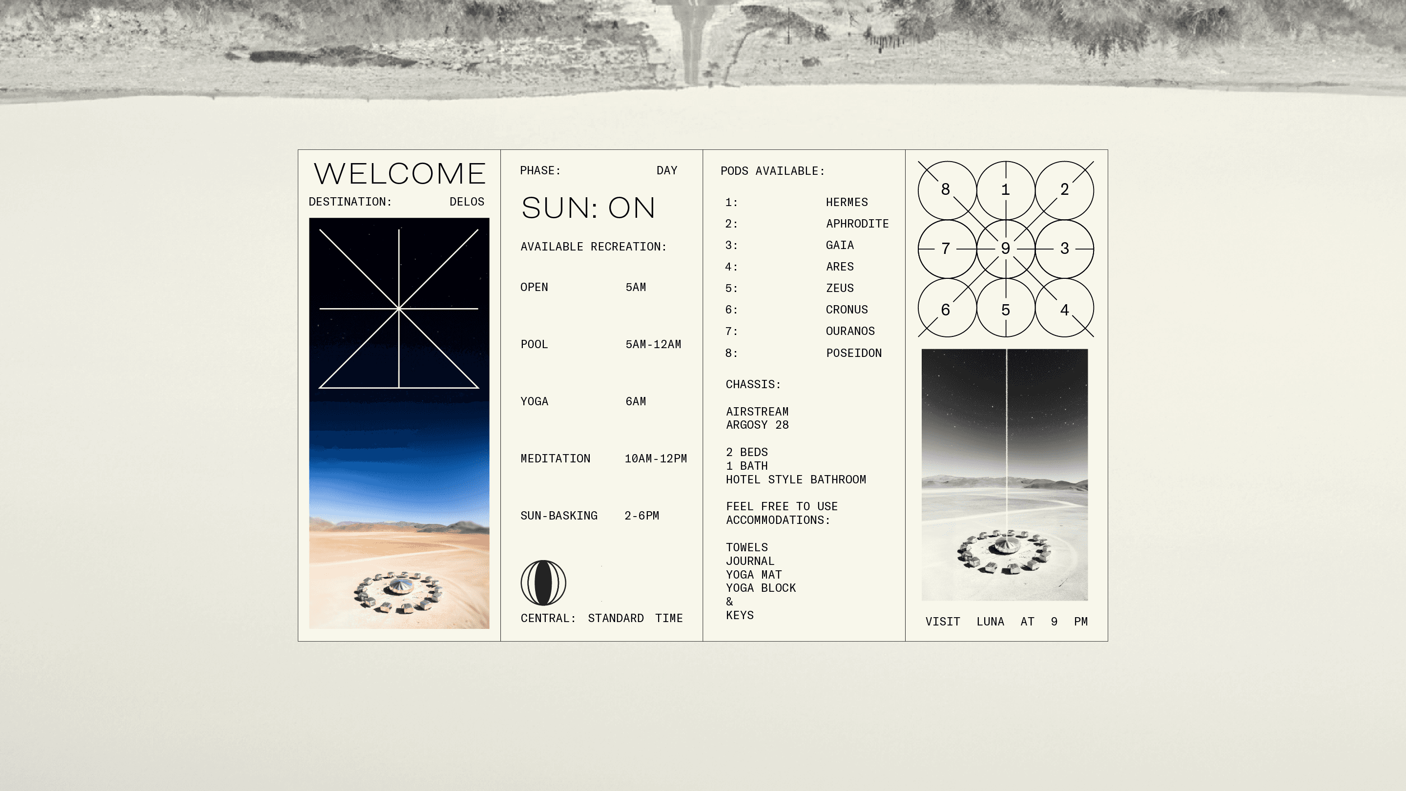 Delos Space Camp located somewhere near 29.7604° N, 95.3698° W (Houston, TX, USA) is an all-inclusive glamping site for all earthly inhabitants.