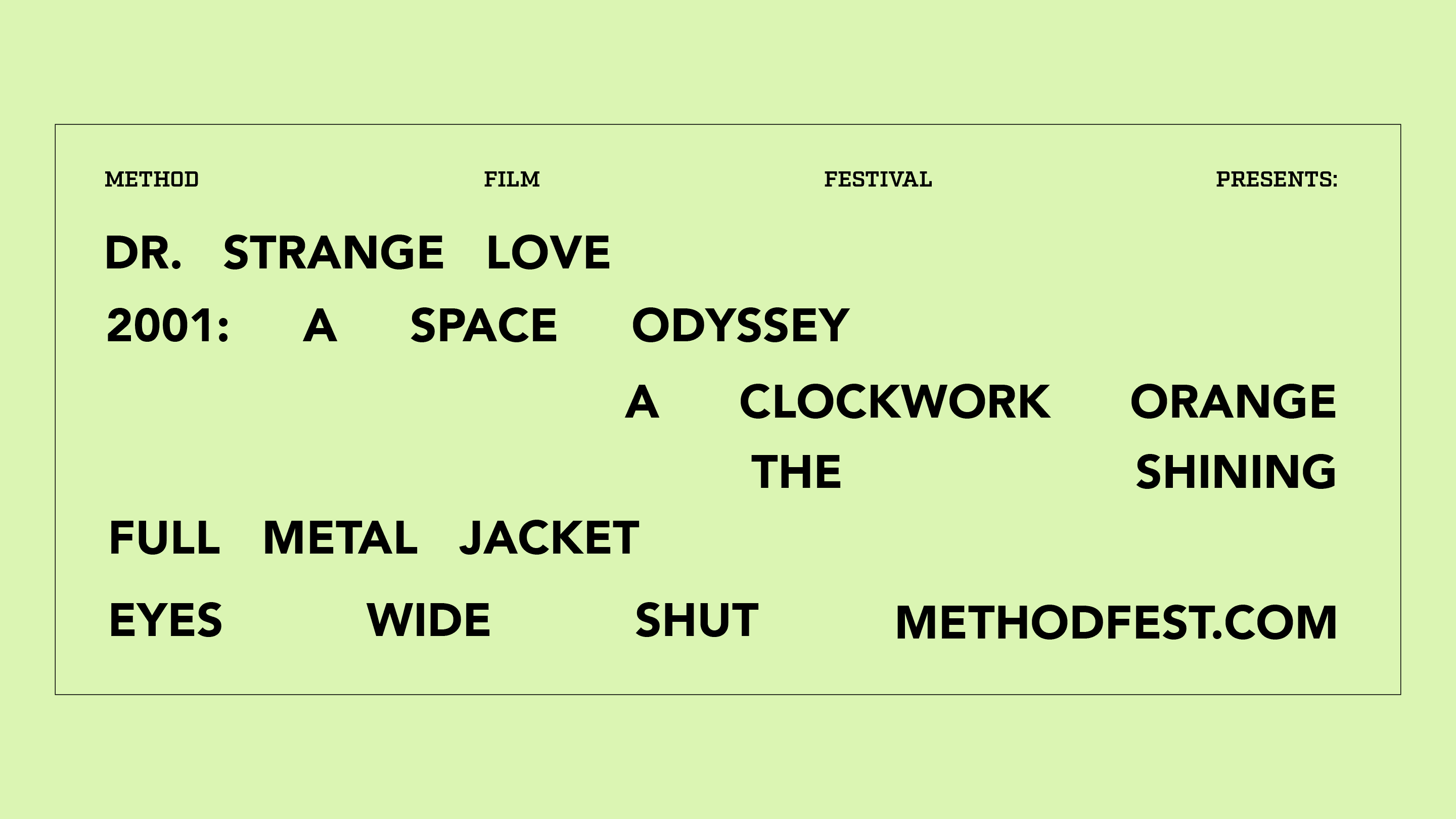 Presenting six classic Stanley Kubrick films, the film festival needs to reflect the methods or manner of Stanley Kubrick as a creator, producer, and filmmaker.